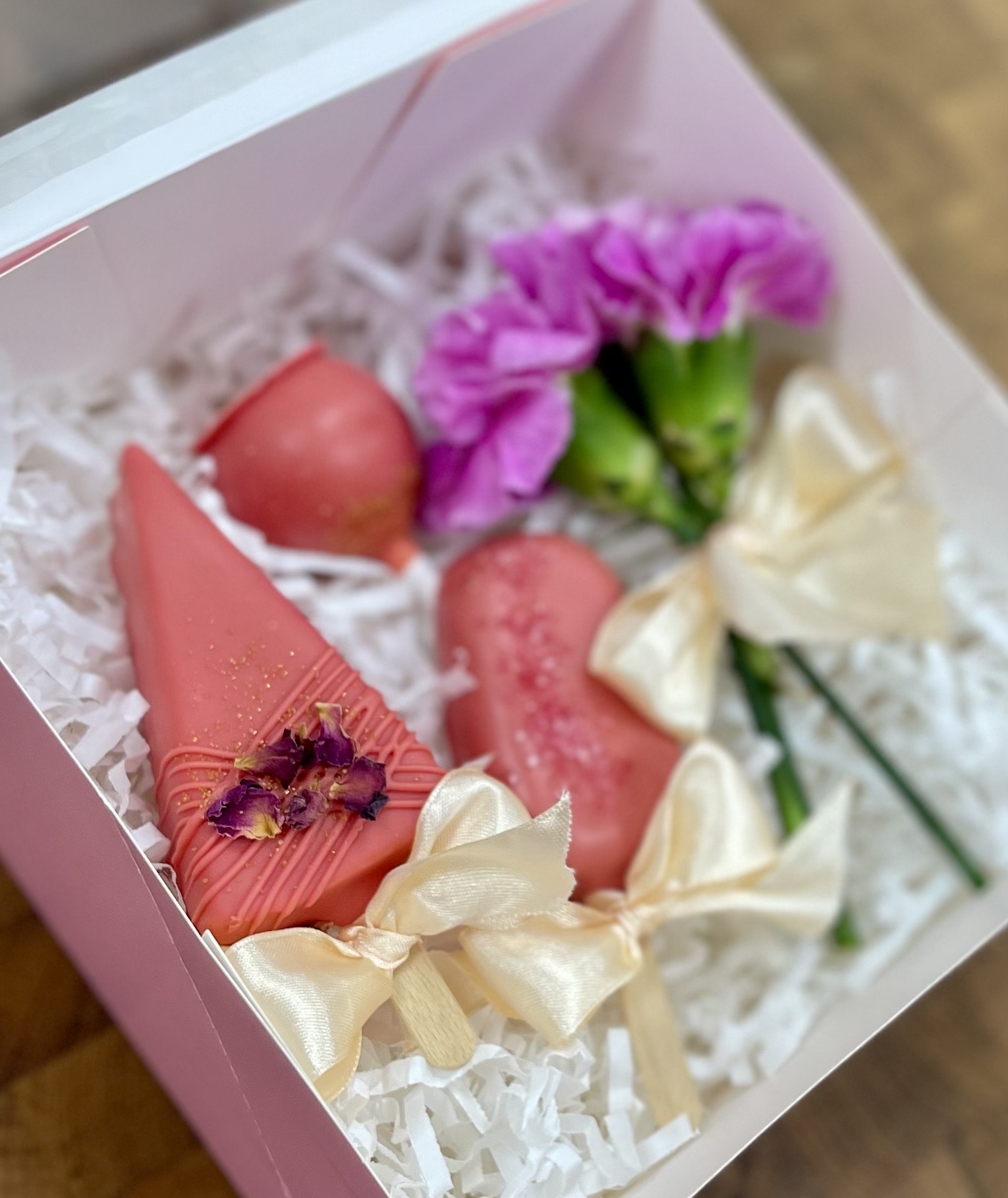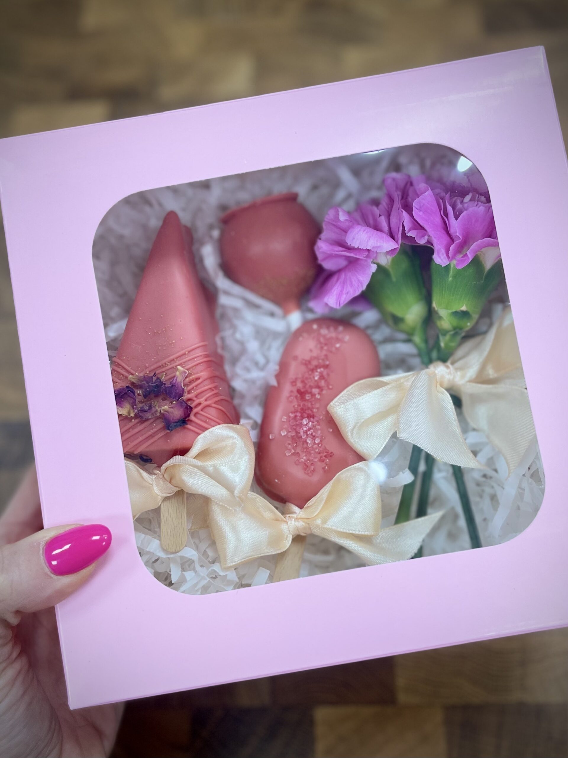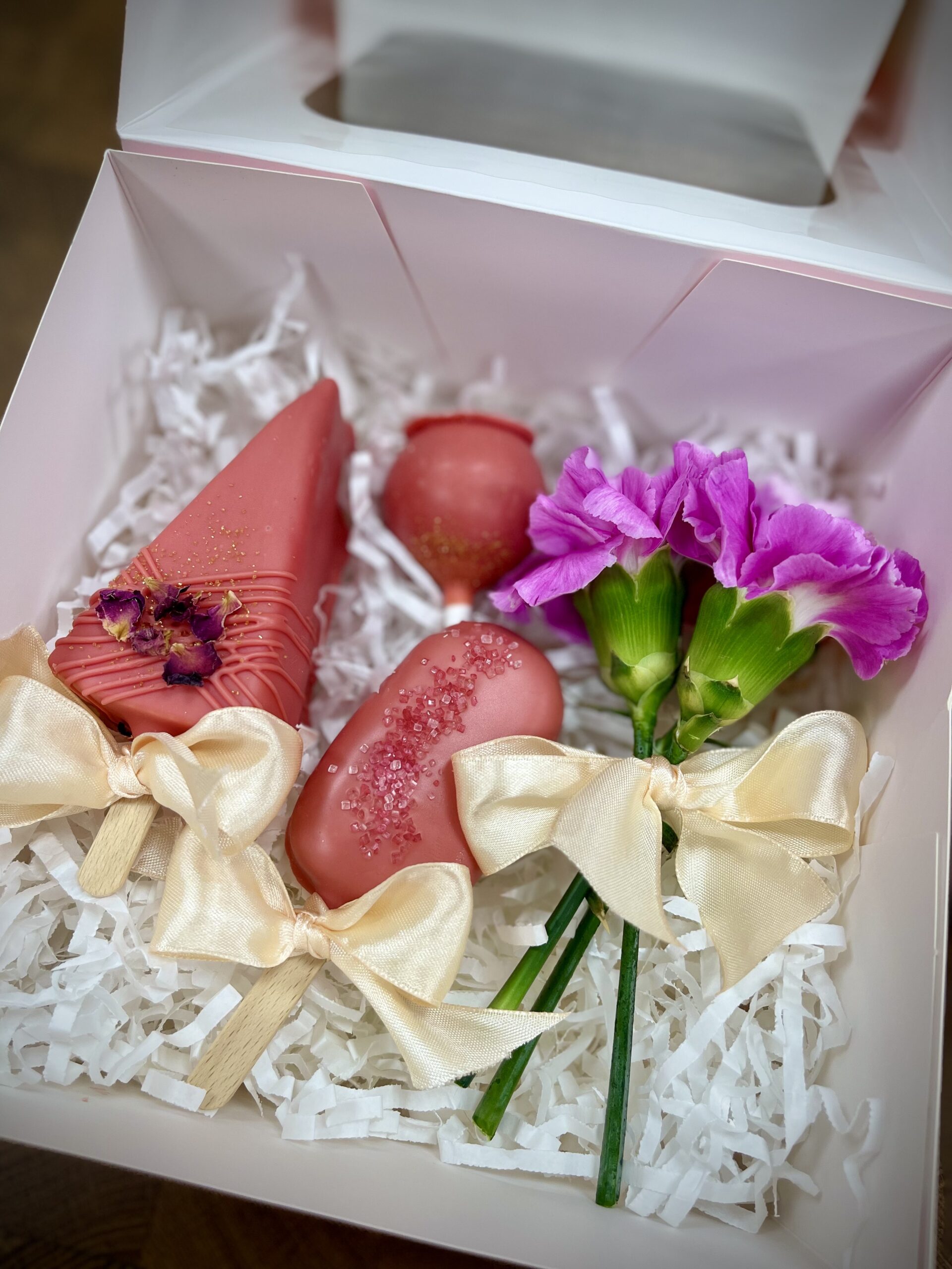 Pudełko przewiązane wstążką z mixem 3 słodkości na patyku + mini bukiecik kwiatów = przepis na gotowy prezent.